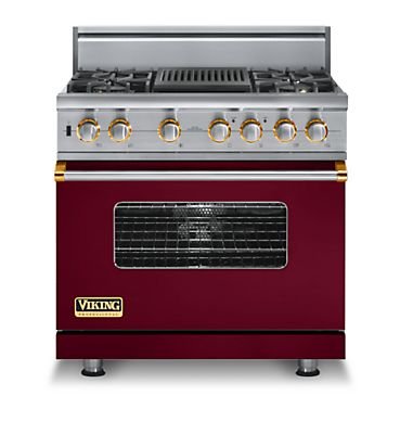 FeaturesSureSpark(TM) Ignition System From low to high, the exclusive SureSpark(TM) ignition system lights every time.VariSimmer(TM) The VariSimmer(TM) setting on Viking gas surface burners allows for precision control of ultra-low cooking temperatures.TruConvec(TM) Convection Cooking TruConvec(TM) Convection Cooking refers to the exclusive air circulation system employed by Viking convection ovens. Uses only convection element in rear of oven and fan-forced air - no direct heat from top or bottom.Gourmet-Glo(TM) Infrared Broiler Lock in all the savory juices of even the thickest porterhouse with the intense heat of the restaurant-quality Gourmet-Glo infrared broiler. Intense heat from broiler sears meats and fish locking in juices.Concealed Bake Element Get more control and less mess with the 10-pass concealed bake element. This dual concealed bake element provides finer temperature control and makes oven clean up easy. Viking VDSC5364QBUBR: 36" Custom Sealed Burner Dual Fuel Range, Natural Gas, Brass Accent?