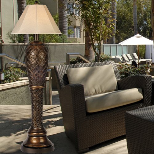 Monterey 60" Floor Lamp?Add fashionable style to your outdoor living area with the Monterey 60" Floor Lamp. With a rich, hand finished, antique bronze decorative base with diamond weave patterns and a wide selection of Sunbrella fabric shades, this chic floor lamp will sui
